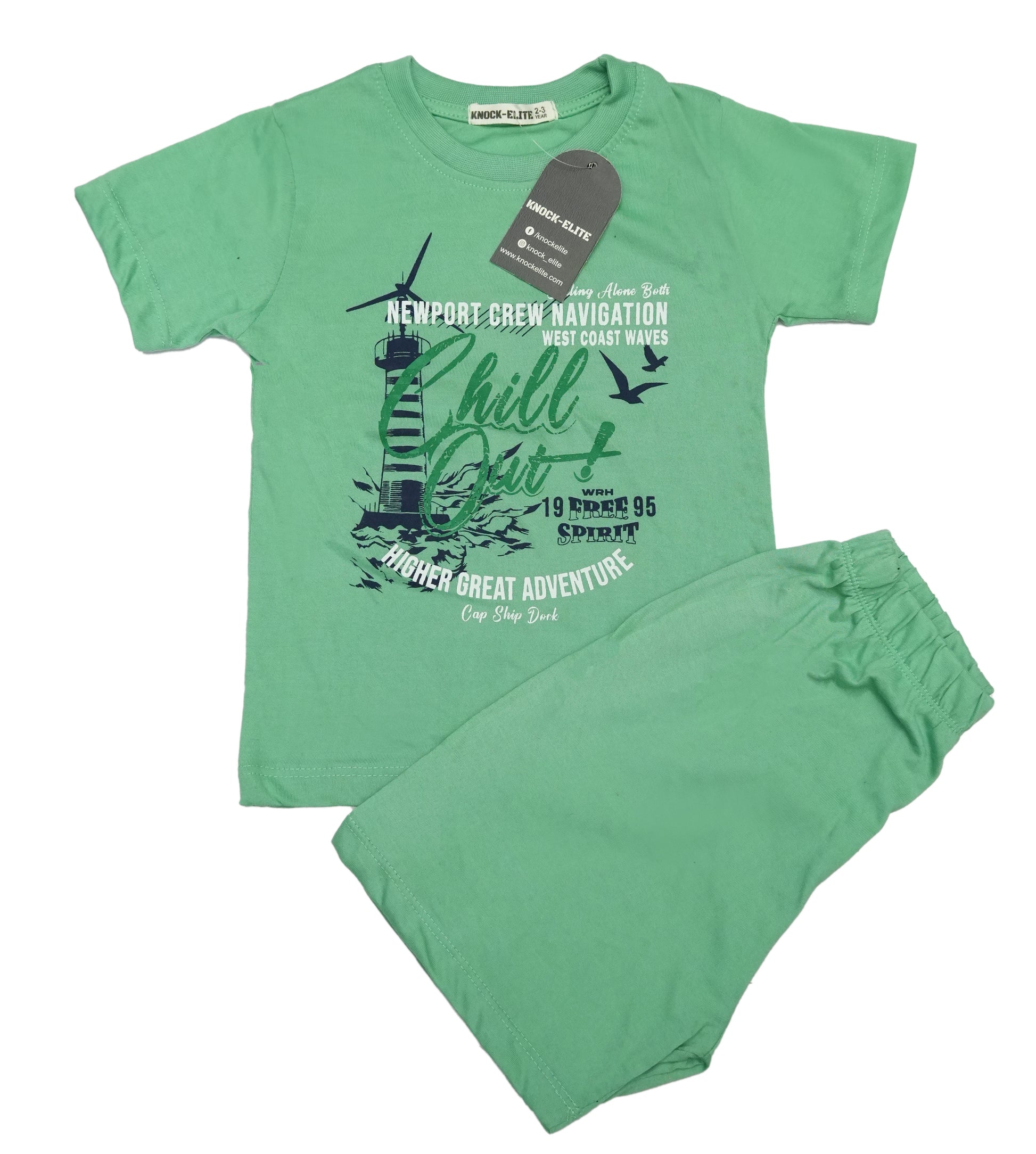 Made from soft cotton, this two-piece outfit features a mint green tee with stylish text graphics and matching shorts — perfect for everyday adventures or relaxed days at home.